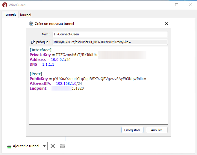 - AllowedIPs = 192.168.1.0/24 : les réseaux accessibles via ce VPN, ici le LAN du site distant. Nous pourrions limiter à certaines adresses IP, ou au contraire indiquer "0.0.0.0/0" pour que tous les flux du PC passent par le VPN WireGuard