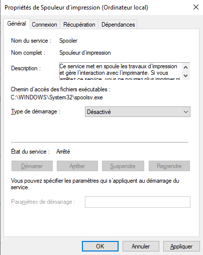1 - Démarrage : le type de démarrage du service, ici, nous allons le désactiver
