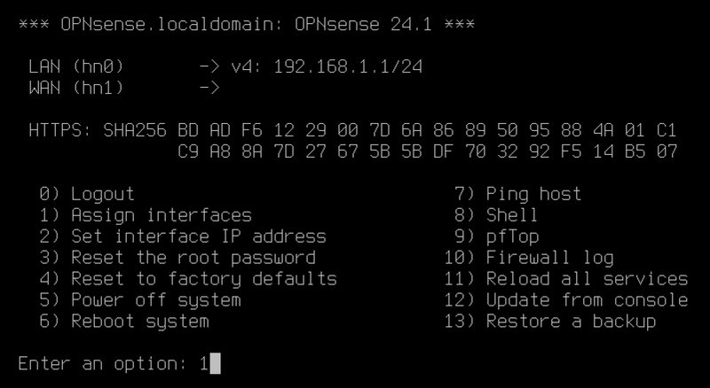 Vous allez arriver sur l'écran présenté ci-dessous. Faites le choix "1" et appuyez sur Entrée pour associer les cartes réseaux de la machine aux interfaces d'OPNsense.