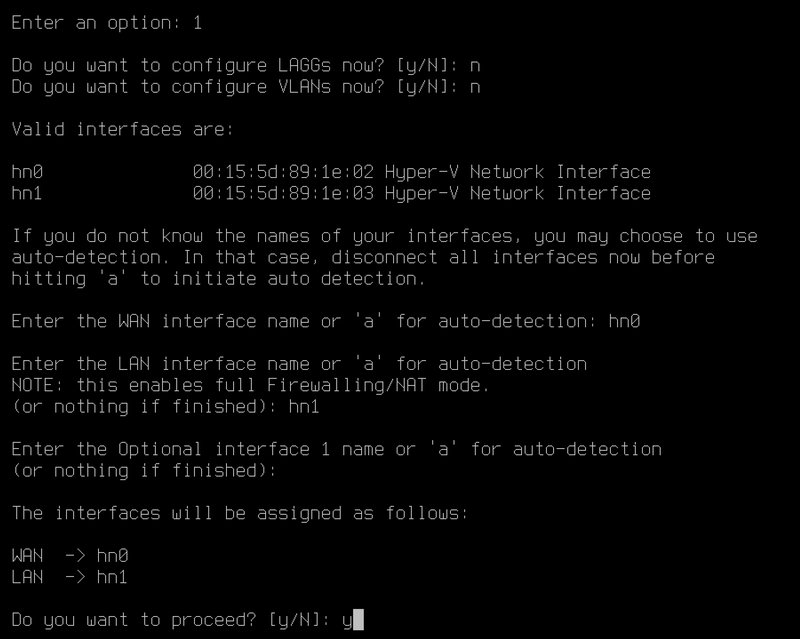 D'abord, l'assistant propose de configurer une agrégation de liens et des VLANs, indiquez "n" pour refuser, et à chaque fois, validez votre réponse avec Entrée. Ensuite, vous devez affecter les deux interfaces : "hn0" et "hn1" au WAN et au LAN. En principe, "hn0" correspond au WAN et l'autre interface au LAN.