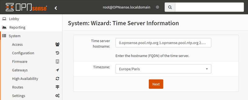 Passez à l'étape suivante. L'assistant vous offre la possibilité de définir un serveur NTP pour la synchronisation de la date et l'heure, bien qu'il y ait déjà des serveurs configurés par défaut. De plus, il est essentiel de choisir le fuseau horaire correspondant à votre emplacement géographique (sauf besoin particulier).