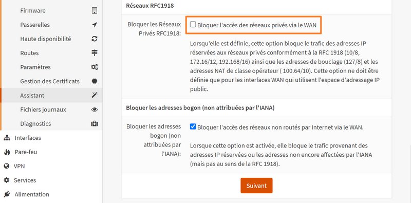 Toujours sur la page de configuration de l'interface WAN, vous devez décocher l'option "Bloquer l'accès à des réseaux privés via le WAN" si le réseau côté WAN utilise un adressage privé. Ce sera probablement le cas si vous faites un Lab, et donc cela peut vous empêcher d'accéder à Internet.