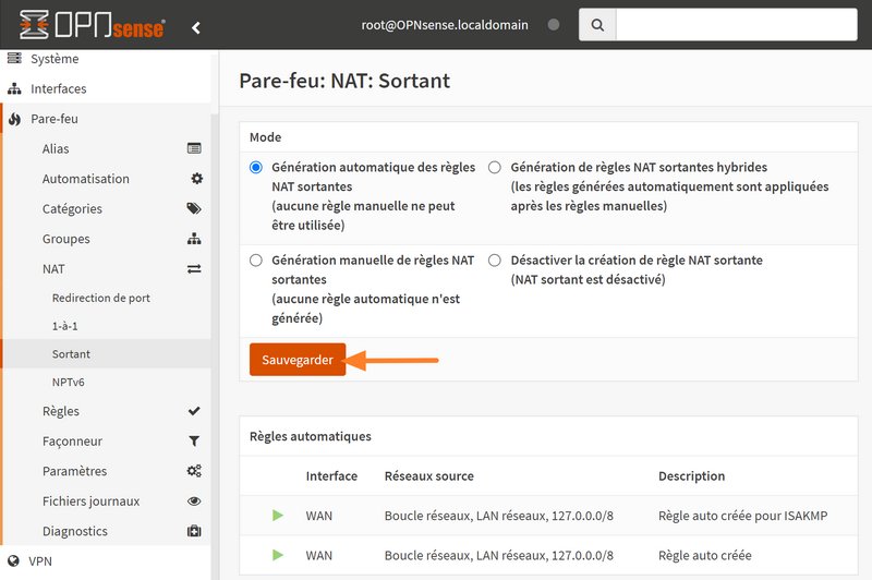 Choisissez le mode automatique via l'option "Génération automatique des règles NAT sortantes" et cliquez sur "Sauvegarder" (en principe, cette configuration est déjà celle active). En mode automatique, OPNsense crée lui-même une règle de NAT pour chacun de vos réseaux.