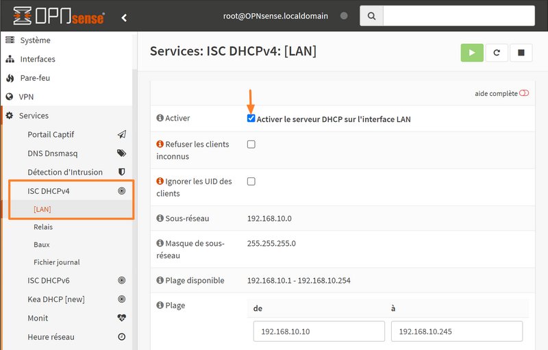 - Activer et configurer le serveur DHCP sur OPNsense pour distribuer une configuration IP aux futures machines connectées au réseau virtuel interne