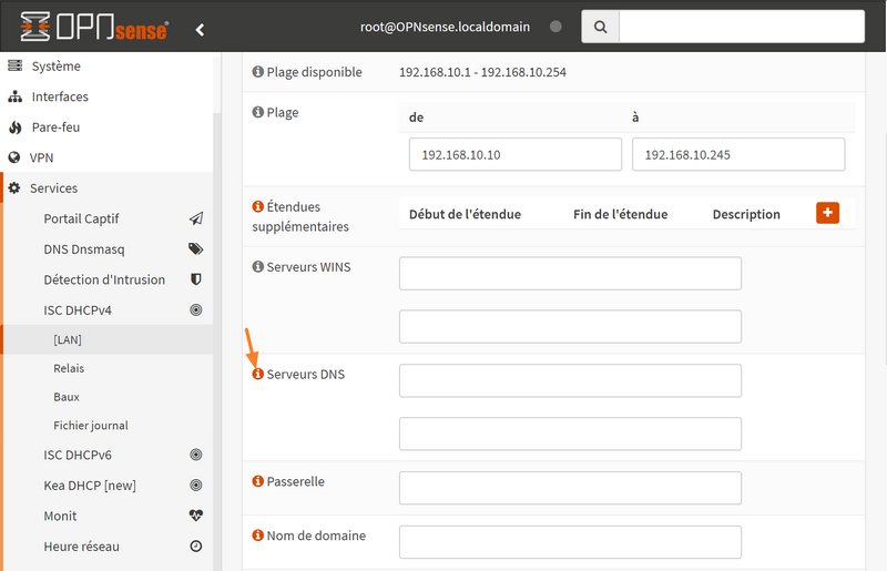Nous pouvons constater aussi que les champs "Serveurs DNS", "Passerelle", "Nom de domaine", etc... sont vides par défaut. En fait, il y a un héritage automatique de certaines options et des valeurs par défaut pour ces différents champs. Par exemple, pour le serveur DNS, l'adresse IP de l'interface LAN sera distribuée ce qui permettra d'utiliser le firewall OPNsense en tant que résolveur DNS.