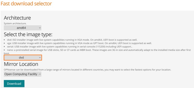Vous aurez aussi besoin de l'image ISO d'installation d'OPNsense à télécharger depuis le site officiel. Pour une installation sur une VM, sélectionnez "dvd" comme type d'image pour obtenir une image ISO (et en faire ce que vous voulez...). Pour une installation via une clé USB bootable, sélectionnez l'option "vga" et vous obtiendrez un fichier ".img".