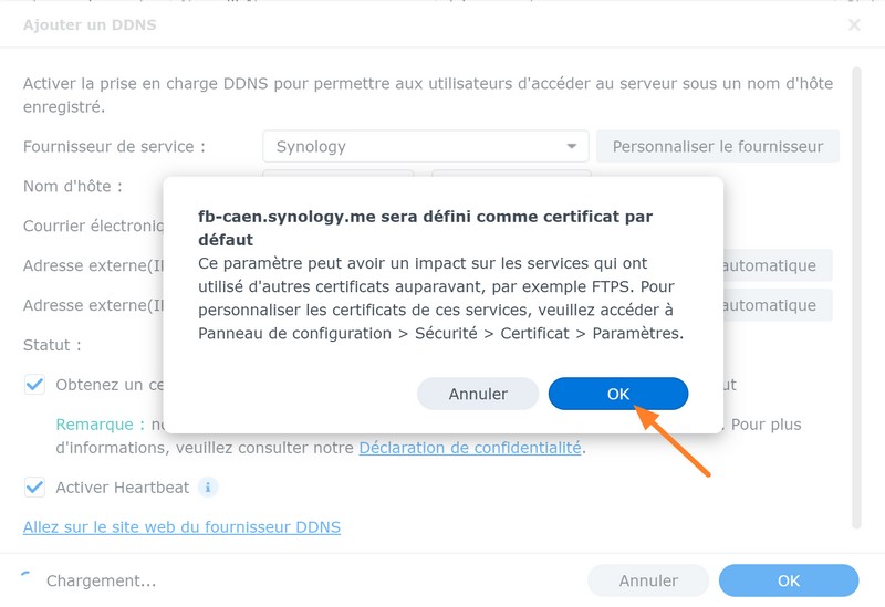 Ici, un avertissement s'affiche pour vous indiquer que le certificat sera utilisé par défaut sur le NAS. En fait, si vous utilisez le FTPS, c'est-à-dire le FTP sécurisé par un certificat, ce sera ce nouveau certificat qui sera utilisé donc l'accès peut-être perturbé temporairement. Par la suite, nous verrons que l'on peut choisir un certificat différent pour chaque service du DSM afin d'éliminer cette contrainte. Pour continuer, cliquez sur "OK".