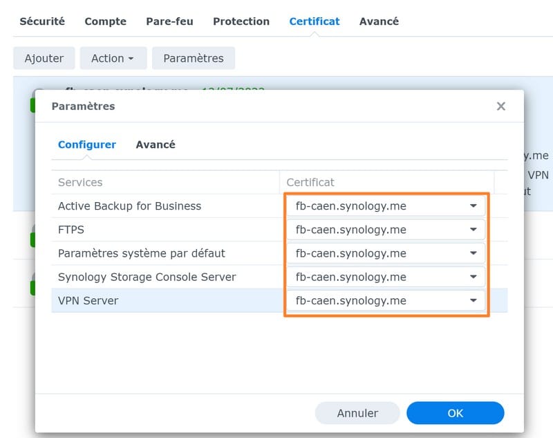 Puisque la configuration est terminée, nous devrions avoir notre certificat SSL Let's Encrypt sur notre NAS ! Afin de le vérifier, ouvrez le "Panneau de configuration", cliquez sur "Sécurité" puis sur l'onglet "Certificat". Comme le montre l'exemple ci-dessous, le certificat pour "fb-caen.synology.me" est bien là et valide pour une durée de trois mois (jusqu'au 12/07/2022). En complément, nous pouvons voir que le certificat est utilisé pour "FTPS, Synology Storage Console Server, VPN Server, etc...", mais c'est personnalisable.