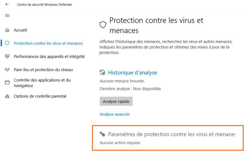 Accédez à "Protection contre les virus et les menaces" puis ensuite cliquez sur "Paramètres de protection contre les virus et menaces".