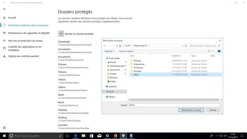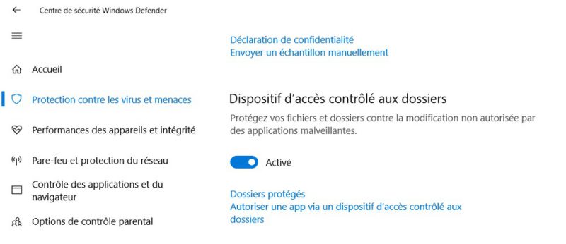 En descendant dans la liste, vous pourrez voir la fonction "Dispositif d'accès contrôlé aux dossiers" ce qui correspond aux dossiers protégés. Je vous invite à activer la fonction et à cliquer sur "Dossiers protégés". Remarquez également la présence de l'option "Autoriser une app via un dispositif d'accès contrôlé aux dossiers" qui permet de définir une application en liste blanche afin de l'autoriser à agir au sein des dossiers protégés.