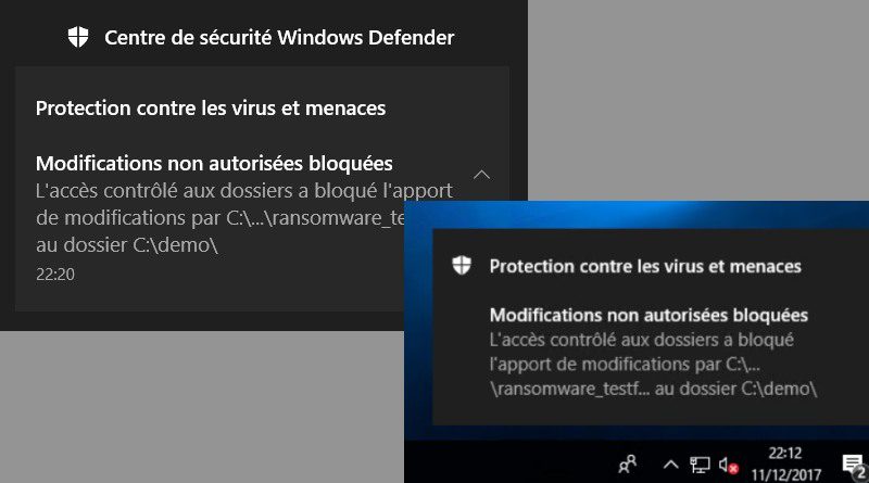 Lorsque la fonctionnalité de dossiers protégés est active, Windows surveille l'activité sur des dossiers cibles, et s'il estime qu'une activité est suspecte ou malveillante au sein de l'un de ces dossiers, l'action sera bloquée. Ceci permet de se protéger contre les actions de chiffrement opérées par les ransomwares.