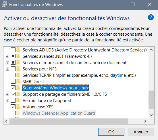 Il faudra penser à activer la fonctionner WSL sur votre machine, en exécutant "optionalfeatures.exe" et en installant "Sous système Linux pour Windows". Un redémarrage est nécessaire à la fin de l'installation.