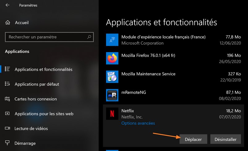 Dans la liste des applications, recherchez "Netflix" (ou une autre application) et cliquez sur le bouton "Déplacer" propre aux applications du Microsoft Store.
