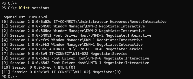 Nous pouvons constater qu'il y a plusieurs sessions, certaines correspondent à la machine, d'autres à des services et d'autres à un utilisateur. En l'occurrence ici, l'utilisateur "IT-Connect\Administrateur".