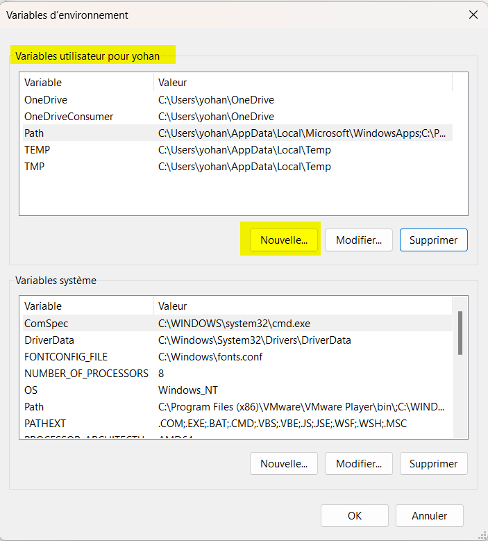 Nous arrivons sur les Variables d’environnement de votre ordinateur, la partie qui va nous intéresser, c'est la section des variables d’environnements utilisateur. Cliquez sur « Nouvelle… »