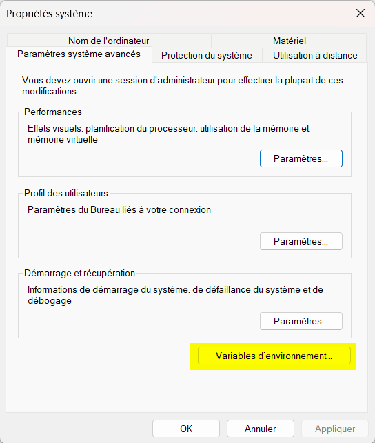 Une nouvelle fenêtre s’ouvre, cliquer suz « Variables d’environnement… ».