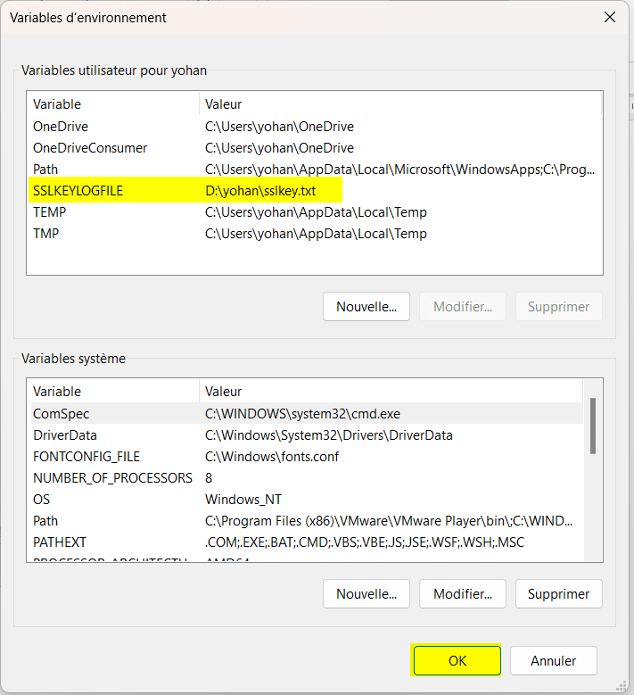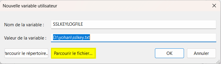 Donnez le nom suivant à la variable : SSLKEYLOGFILE