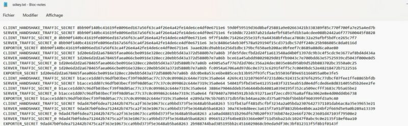 Pour valider l’enregistrement des clés de sessions TLS, il suffit d’aller sur internet et de regarder si le fichier txt créé précédemment se remplit. Ouvrez votre fichier txt, vous devriez voir les lignes suivantes créer.