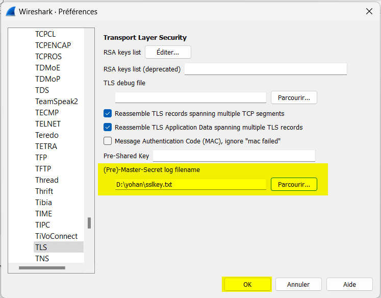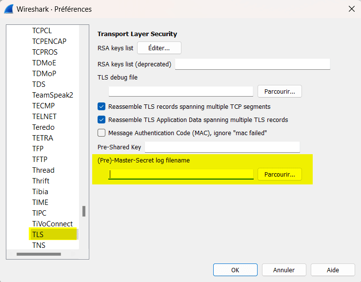 On arrive à la page de configuration du protocole TLS. Pour lier votre fichier txt de clés sessions TLS, il suffit de renseigner la localisation de votre fichier en cliquant sur « Parcourir… » au niveau de « (Pre)-Master-Secret log filename ». Ici :