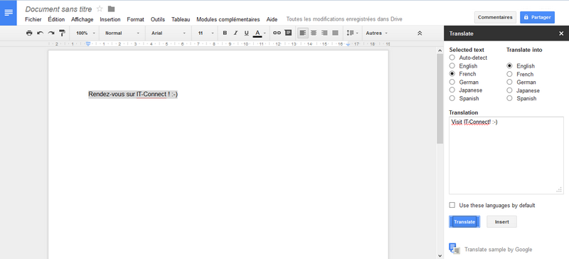 Comme on peut le voir sur l'image ci-dessus, après installation et lorque vous l'activez, le plug-in s'affiche sur la droite sous la forme d'un volet et permet de traduire du texte. En fait, vous sélectionnez du texte de votre document et cliquez sur "Translate" pour afficher la traduction dans la langue choisie (Translate into).