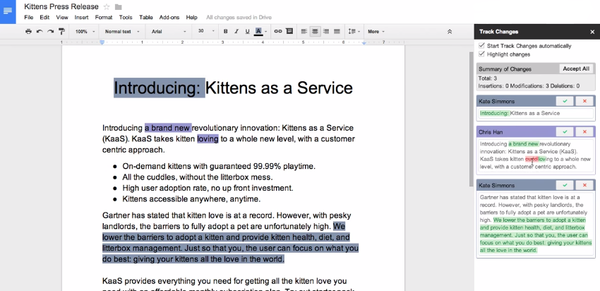 Cette extension facilite la collaboration à plusieurs sur un même document. En effet, vous pouvez voir les modifications effectuées par un autre utilisateur, ensuite vous pouvez les approuver ou les refuser de la même façon qu'il est possible de le faire sous Microsoft Word.