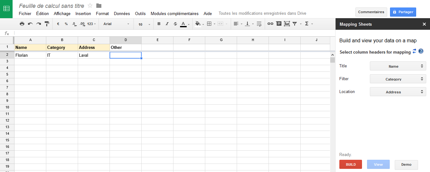 Toujours pour Google Sheets, ce plug-in vous permet de générer une carte Google Maps à partir de données saisies dans une feuille de tableur. Pour cela, vous devez remplir des colonnes spécifiques afin d'indiquer, un nom pour la location, une catégorie et l'adresse.