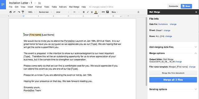 Si vous souhaitez faire de la fusion entre un document Google Docs et un tableur Google Sheets afin de générer des lettres à la volée, ce plug-in devrait vous intéresser ! En effet, vous définissez un document type contenant des champs dynamiques, et, à partir des données saisies dans un tableur les documents vont être générés automatiquement.