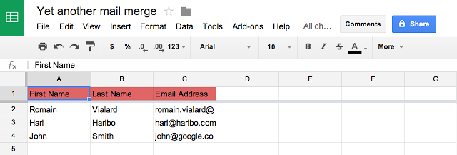 Dans le même esprit que l'extension DocumentMerge, le plug-in Yet Another Mail Merge permet de générer un e-mailing à partir de données saisies dans une feuille Google Sheets. Il suffit d'insérer des champs dynamiques dans un e-mail modèle et ensuite les données seront remplacées dynamiquement et les mails envoyés à vos destinataires.