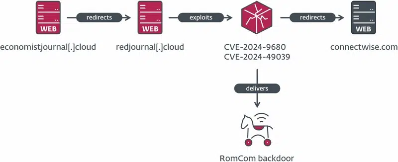 "La chaîne de compromission est composée d'un faux site web qui redirige la victime potentielle vers le serveur hébergeant l'exploit. Si l'exploit réussit, un shellcode est exécuté qui télécharge et exécute la porte dérobée RomCom.", peut-on lire dans le rapport d'ESET.