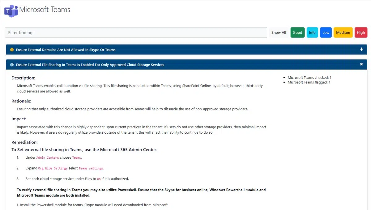 Par exemple, si vous cliquez sur "Microsoft Teams", vous obtenez le résultat de l'audit en ce qui concerne la configuration de Teams sur votre tenant. Vous pouvez effectuer une recherche et filtrer les résultats par niveau de criticité en cliquant sur les boutons en haut à droite.