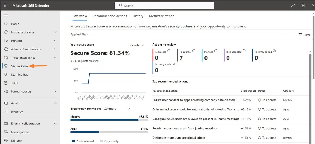 Le tableau de bord indique le Secure Score de votre tenant : plus il est élevé, mieux c'est ! Vous pouvez voir son évolution dans le temps et vous avez un score par catégorie.