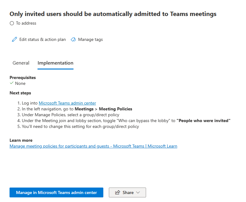 Si vous cliquez sur une recommandation, vous pouvez obtenir des détails à son sujet. Il y a une description plus précise et un onglet "Implementation" qui vous permet d'avoir des instructions pour appliquer cette bonne pratique.