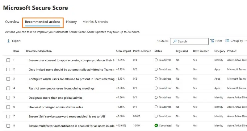 Si vous cliquez sur "Recommended actions", vous pouvez accéder à la liste des recommandations. Cette liste contient toutes les recommandations : celles à appliquer et celles déjà appliquées. Grâce aux colonnes et aux filtres, vous pouvez facilement identifier les actions à effectuer pour respecter les recommandations de Microsoft.