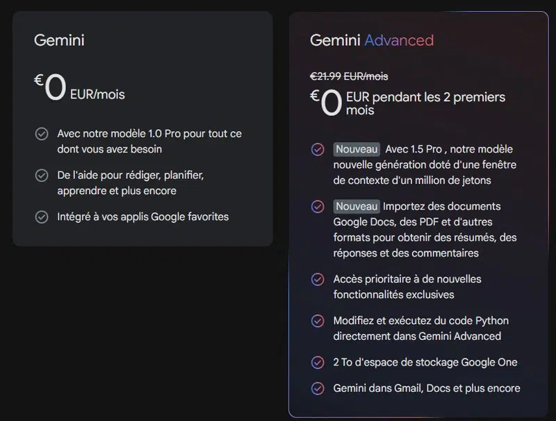L'abonnement Google One AI Premium commercialisé aux États-Unis jusqu'ici, arrive en France. Facturé 21.99 euros par mois par Google, avec deux mois offerts, il donne accès à du stockage en ligne ainsi qu'à un Gemini plus performant. Pour Google, c'est une façon de se positionner face à OpenAI et son abonnement ChatGPT Plus.
