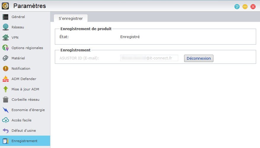 Il est obligatoire d’enregistrer votre produit auprès d’Asustor et de disposer d’un « ASUSTOR ID » (compte personnel). Si ce n’est pas déjà le cas, accéder à l’interface web d’administration du NAS, puis dans « Paramètres » accéder à la section « Enregistrement ».