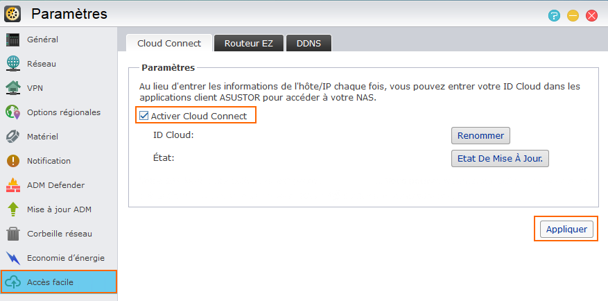Toujours dans la section « Paramètres », on va maintenant se rendre dans « Accès facile ». Cliquez sur « Activer Cloud Connect » et « Appliquer ».