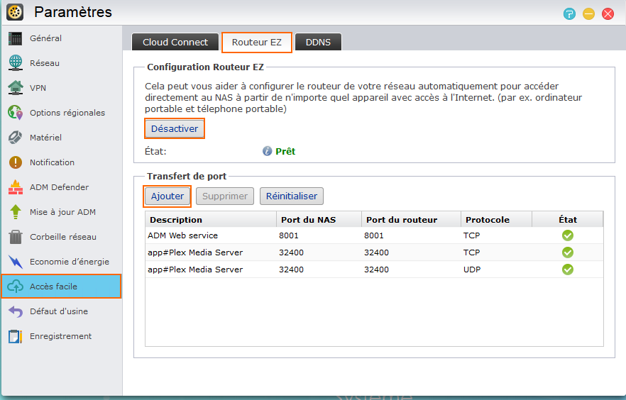 Toujours dans la section « Accès facile », allez cette fois-ci dans l’onglet « Routeur EZ » et activez la fonctionnalité (bouton « Activer »). Une fois que le NAS aura vérifié que votre box/routeur est compatible avec Routeur EZ, l’état passera sur « Prêt ».