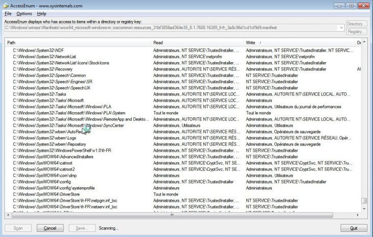 Celui-ci peut être lancé en tant qu'administrateur ou en tant qu'utilisateur standard, sans installation et permet de lister les droits sur tous les répertoires du système. Cela peut être bien pratique dans bien des contextes, autant en attaque qu'en défense. Coté défensif, cela permet de savoir dans quels répertoires un utilisateur non privilégié est autorisé à créer de nouveaux fichiers, c'est notamment utile dans le cas des malwares, qui aiment trouver des répertoires méconnus afin de s'y installer (notamment dans C:\windows)