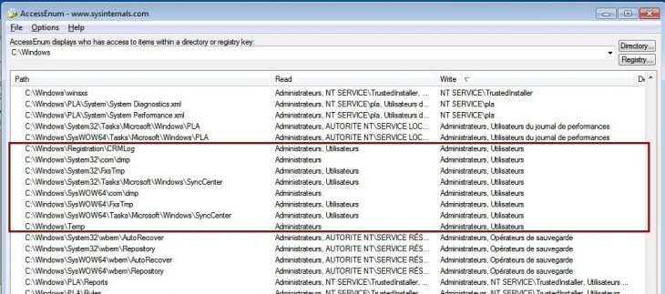 Parmi les résultats intéressants que l'on peut constater et remarquer avec AccessEnum, voici quelques répertoires sur mon système Windows 7 qui sont accessibles à tous les utilisateurs dans C:\Windows