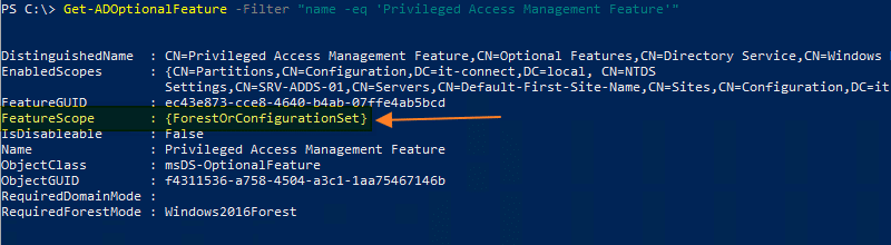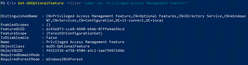 Enable-ADOptionalFeature 'Privileged Access Management Feature' -Scope ForestOrConfigurationSet -Target it-connect.local
