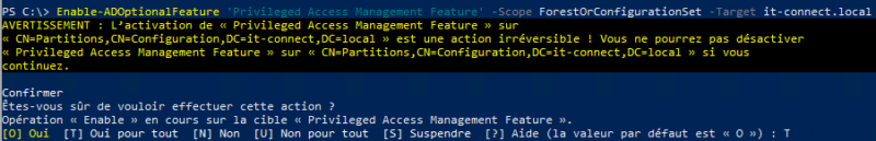 Via PowerShell en disposant des privilèges administrateur : Enable-ADOptionalFeature 'Privileged Access Management Feature' -Scope ForestOrConfigurationSet -Target it-connect.local (remplacez par votre domaine).