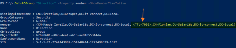 Si l'on regarde les membres du groupe "Direction" en interface graphique ou avec PowerShell et la commande Get-ADGroup, rien n’indique que le compte est ajouté temporairement au groupe.