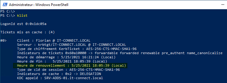 Si l'on compare l'heure de renouvellement du ticket avec l'heure de fin de mon autorisation temporaire, on constate que mon ticket Kerberos expire au même moment que l'appartenance temporaire à mon groupe : ce n'est pas un hasard. Au moment venu, l'utilisateur sera retiré du groupe et dans le même temps, un nouveau ticket Kerberos sera créé pour tenir compte du fait que mon utilisateur n'est plus membre de ce groupe.