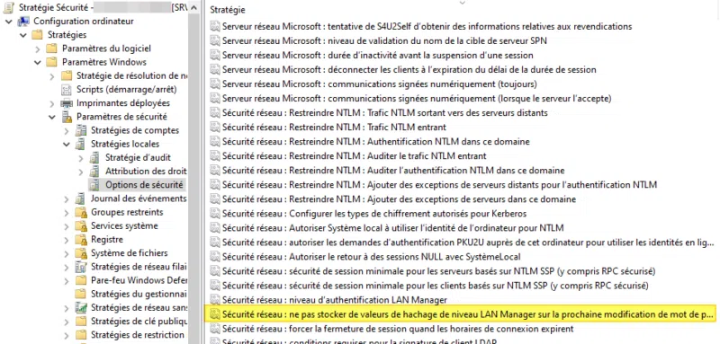 Ce paramètre s'intitule de cette façon : "Sécurité réseau : ne pas stocker de valeurs de hachage de niveau LAN Manager sur la prochaine modification de mot de passe". Vous devez définir ce paramètre et l'activer. Tout en sachant qu'il s'agit déjà du comportement par défaut avec Windows Server 2008 et les versions plus récentes.