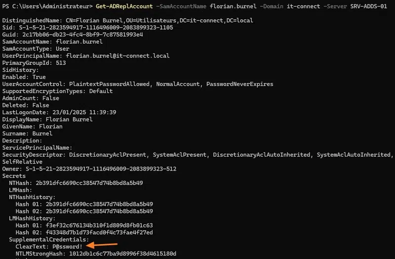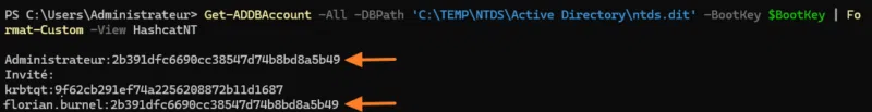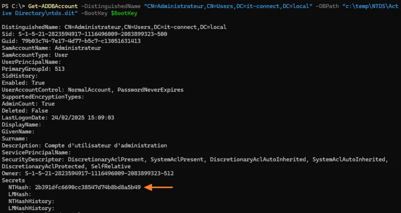 Get-ADDBAccount -DistinguishedName "CN=Administrateur,CN=Users,DC=it-connect,DC=local" -DBPath "c:\temp\NTDS\Active Directory\ntds.dit" -BootKey $BootKey