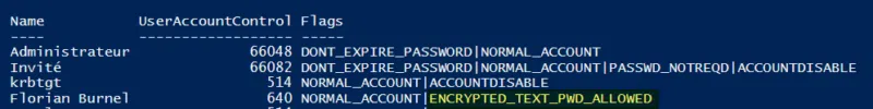 En exécutant un script PowerShell (que vous pouvez retrouver dans l'article cité ci-dessus), vous pouvez "convertir" la valeur UserAccountControl et afficher les flags actifs. Dans le cas de l'utilisateur pour lequel l'option a été activée précédemment, nous pouvons voir la présence du flag nommé ENCRYPTED_TEXT_PWD_ALLOWED. Il prouve que l'option a été cochée dans les paramètres du compte et qu'il y a un impact direct sur la valeur de l'attribut UserAccountControl.