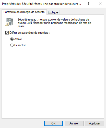 Ce paramètre s'intitule de cette façon : "Sécurité réseau : ne pas stocker de valeurs de hachage de niveau LAN Manager sur la prochaine modification de mot de passe". Vous devez définir ce paramètre et l'activer. Tout en sachant qu'il s'agit déjà du comportement par défaut avec Windows Server 2008 et les versions plus récentes.