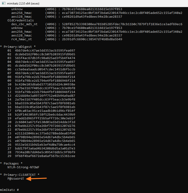 Si nous regardons de plus près les informations retournées par la commande, nous pouvons voir la valeur NTHash : 2b391dfc6690cc38547d74b8bd8a5b49 ! Le LMHash quant à lui est vide, ce qui est cohérent sur un environnement sous Windows Server 2025.