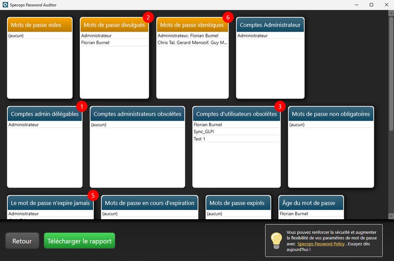 - Conformité des politiques de mots de passe (ANSSI, CNIL, NIST, BSI, etc.)