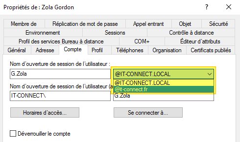 Dans l'onglet "Compte", vous allez pouvoir modifier le domaine associé à son UPN, comme ceci :